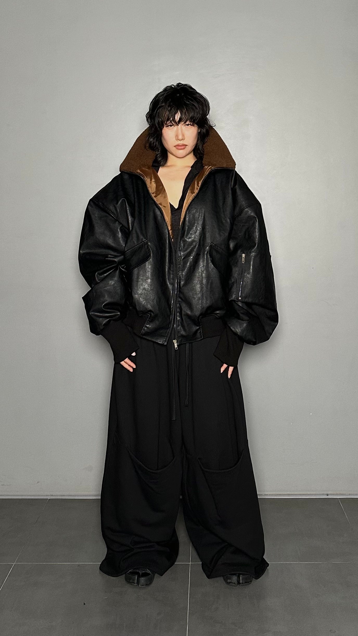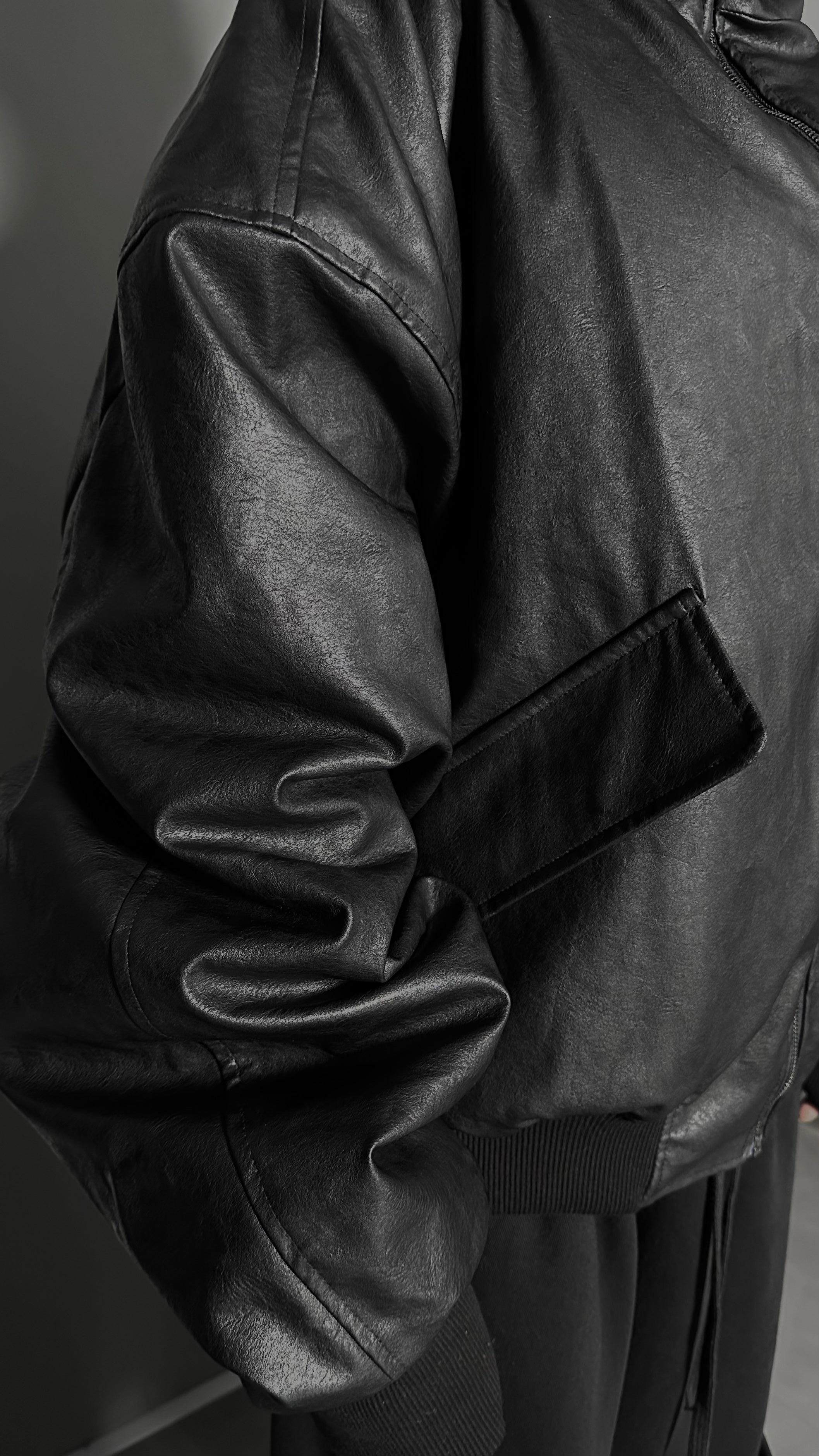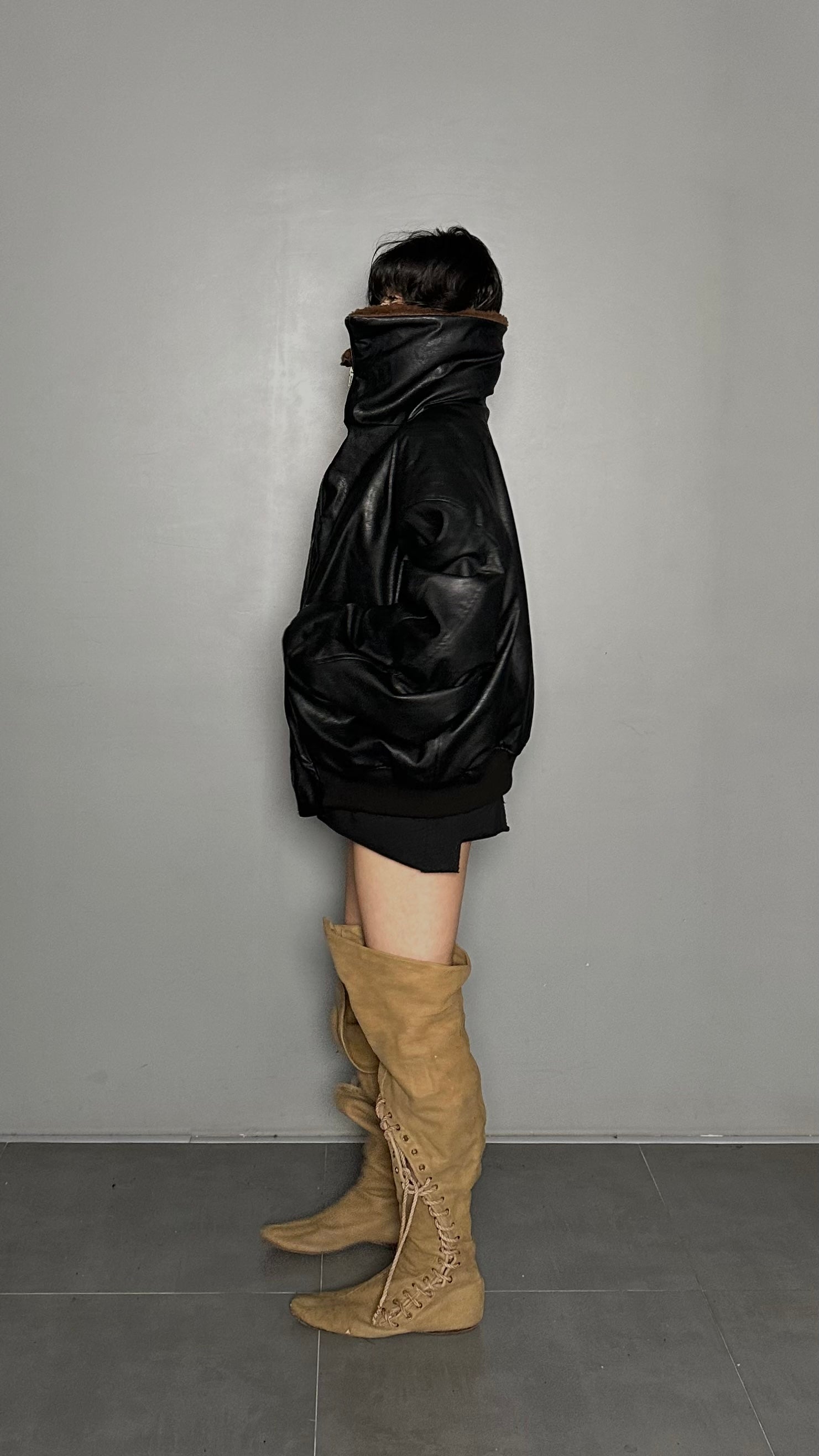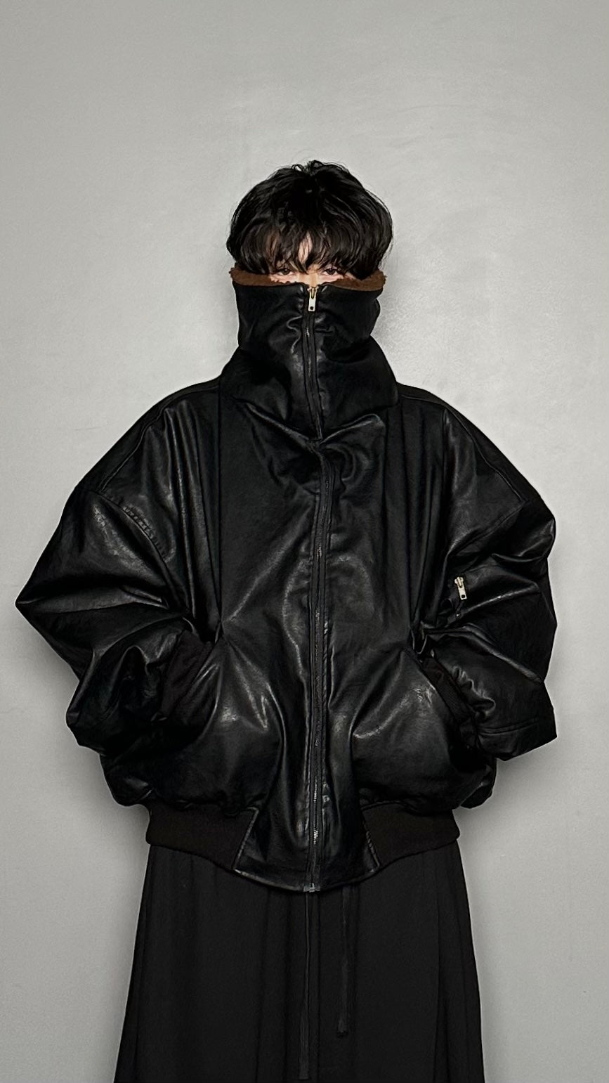 An oversized outerwear piece crafted in sleek faux leather for both functionality and style.
