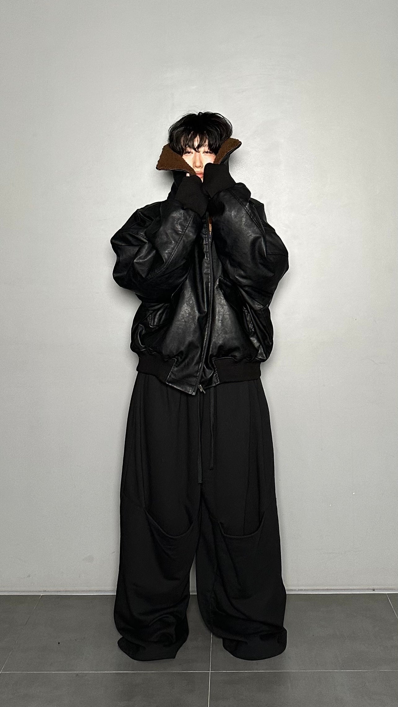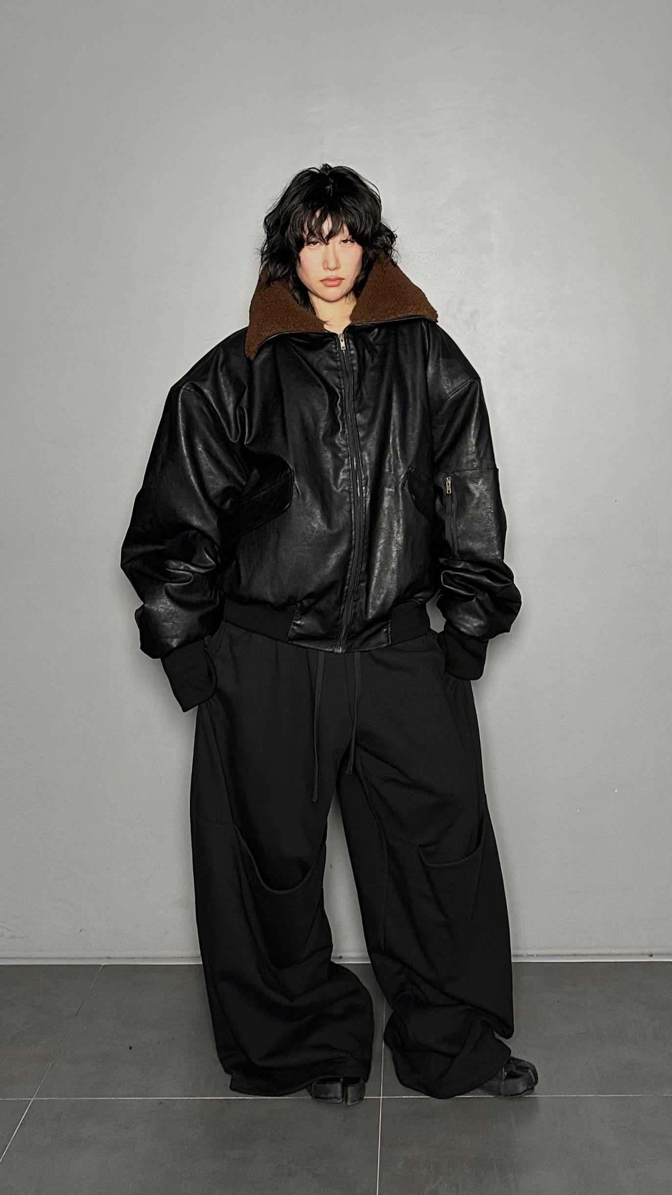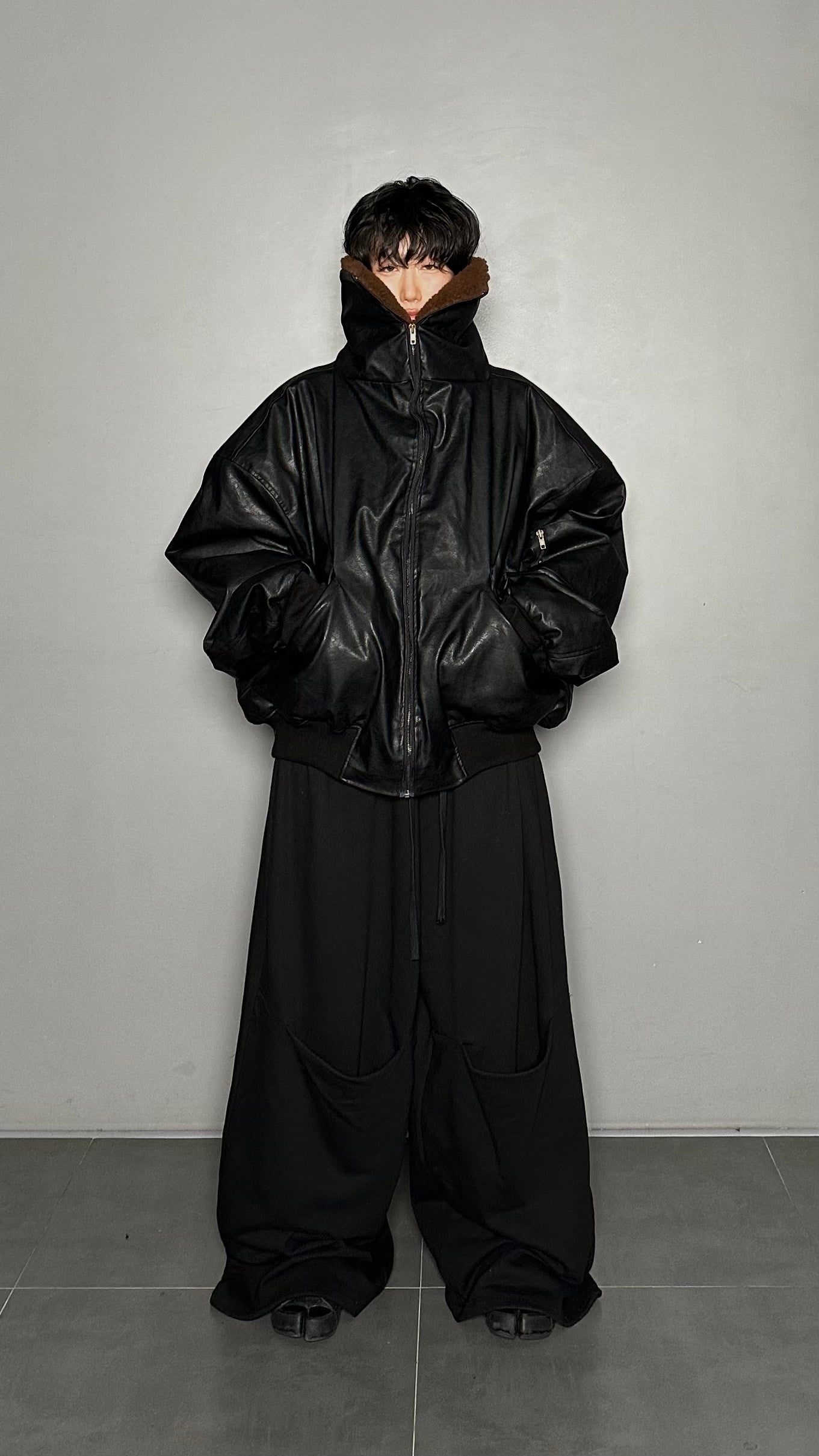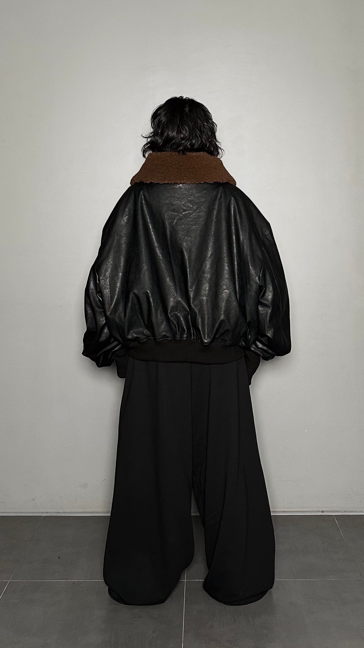 An oversized outerwear piece crafted in sleek faux leather for both functionality and style.